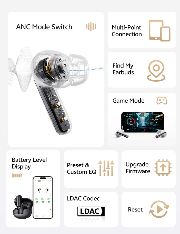 Com 3 sensores inteligentes por auricular, o QCY PureSilenz™ bloqueia ruídos de todas as direções. Desfrute de cancelamento de ruído ultralargo até 5,5 kHz para uma experiência auditiva clara e sem interrupções em qualquer lugar.