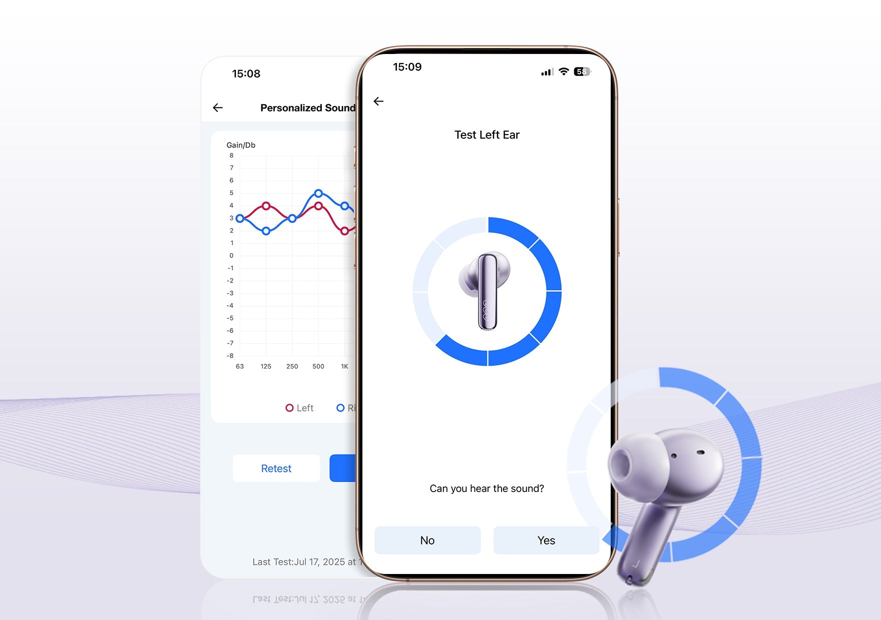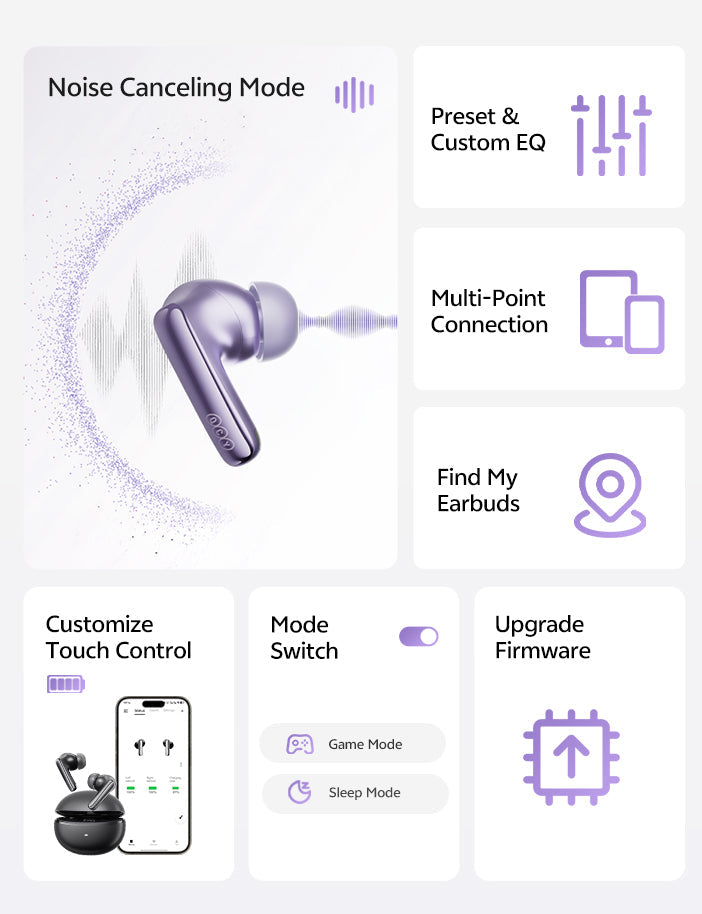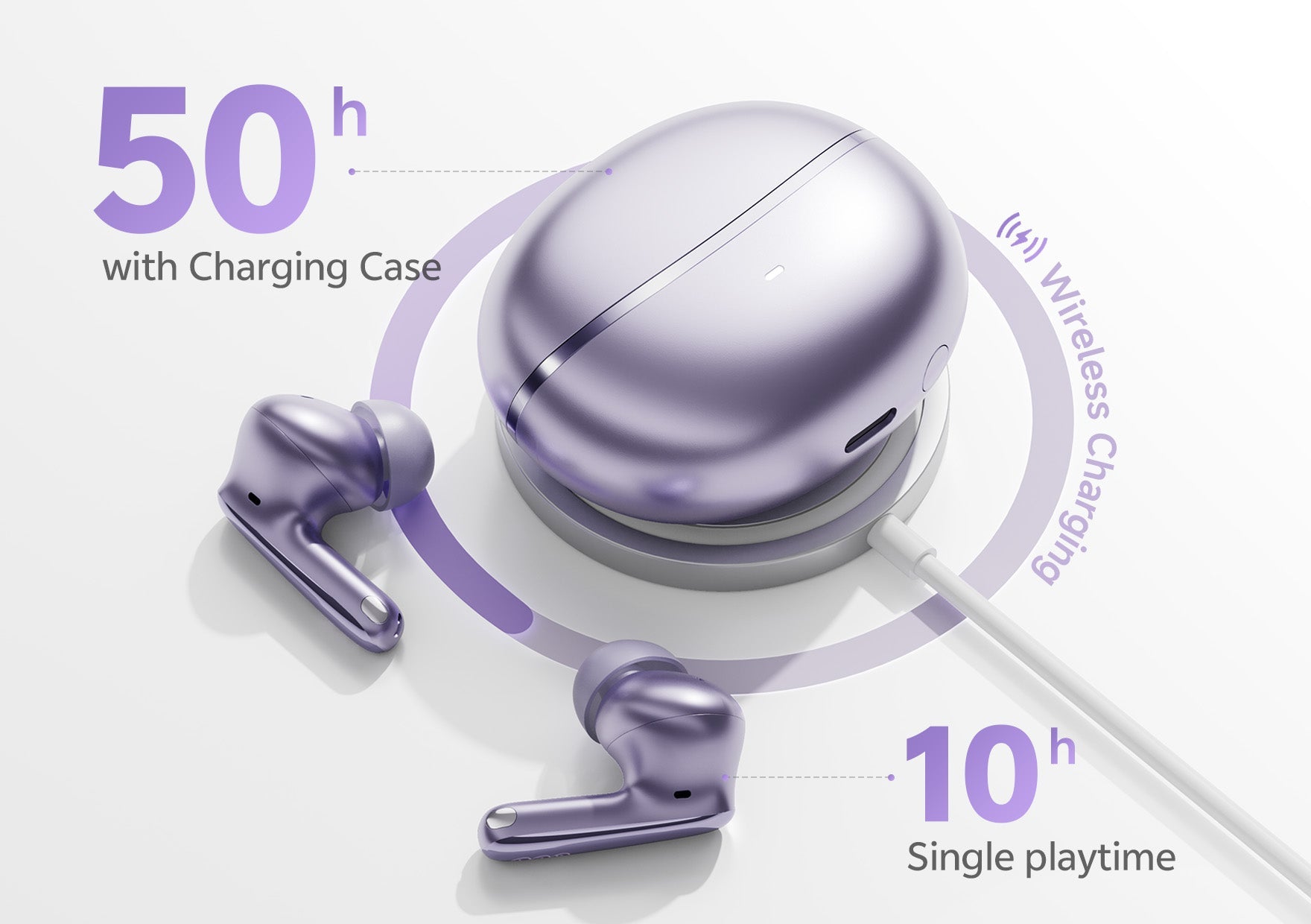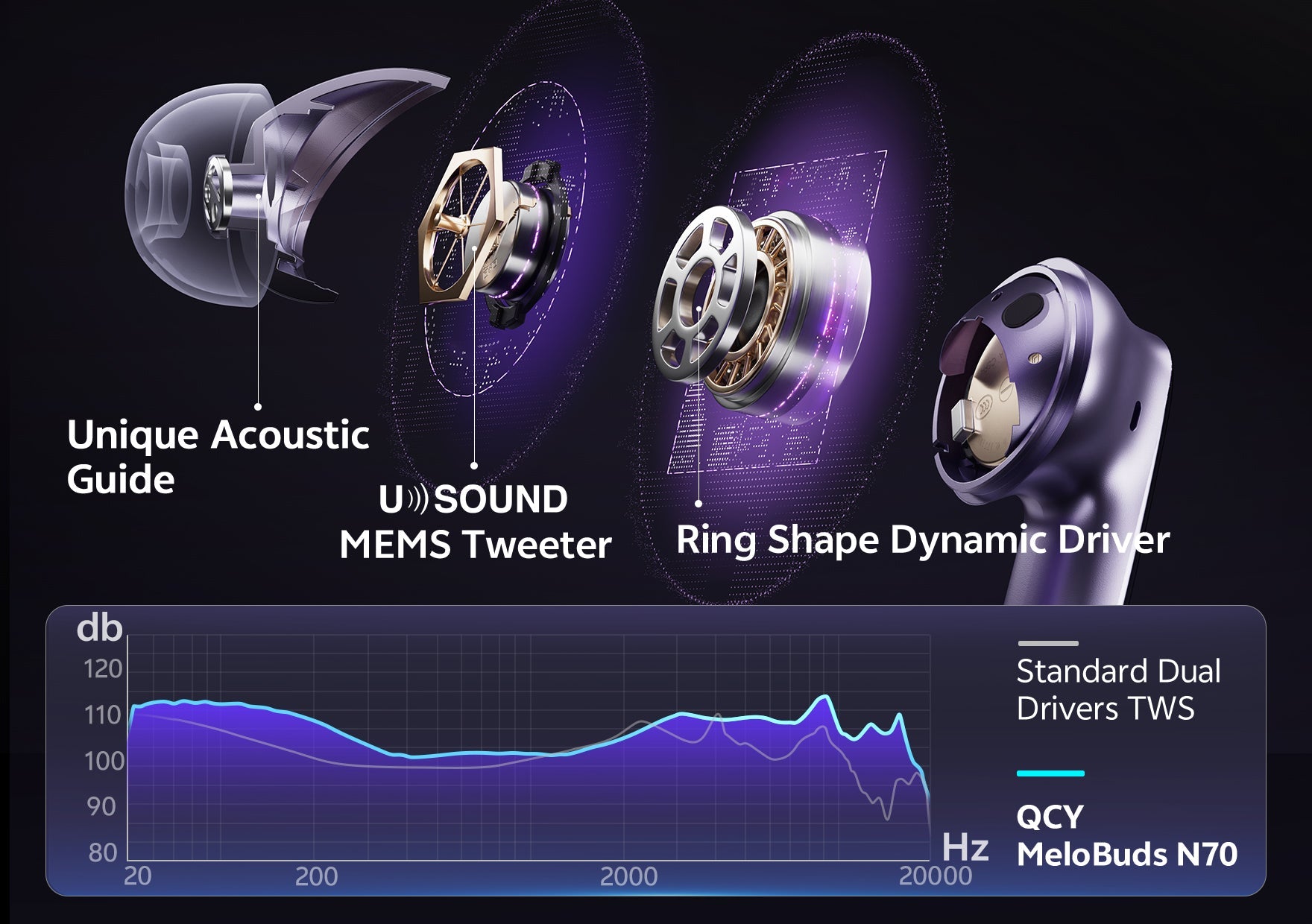 Com três avançados sensores de ruído em cada auricular, os MeloBuds N70 bloqueiam vozes, toques de teclado, ruídos de altifalantes e até mesmo o ronco, reduzindo o ruído numa ampla gama de 5 kHz.